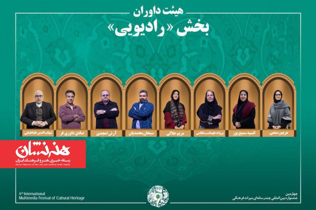 به گزارش هنرنشان به نقل از ستاد خبری جشنواره، در بخش «رادیو» چهارمین جشنواره بین‌المللی چندرسانه‌ای میراث‌فرهنگی مریم جلالی، مریم رستمی، انسیه سمیع‌پور، پروانه طهماسب‌نظامی، سبحان محمدیان، آرش امجدی، صادق داوری‌فر و شهاب‌الدین طباطبایی به عنوان اعضای هیئت داوران آثار راه‌یافته به این بخش را داوری می‌کنند.