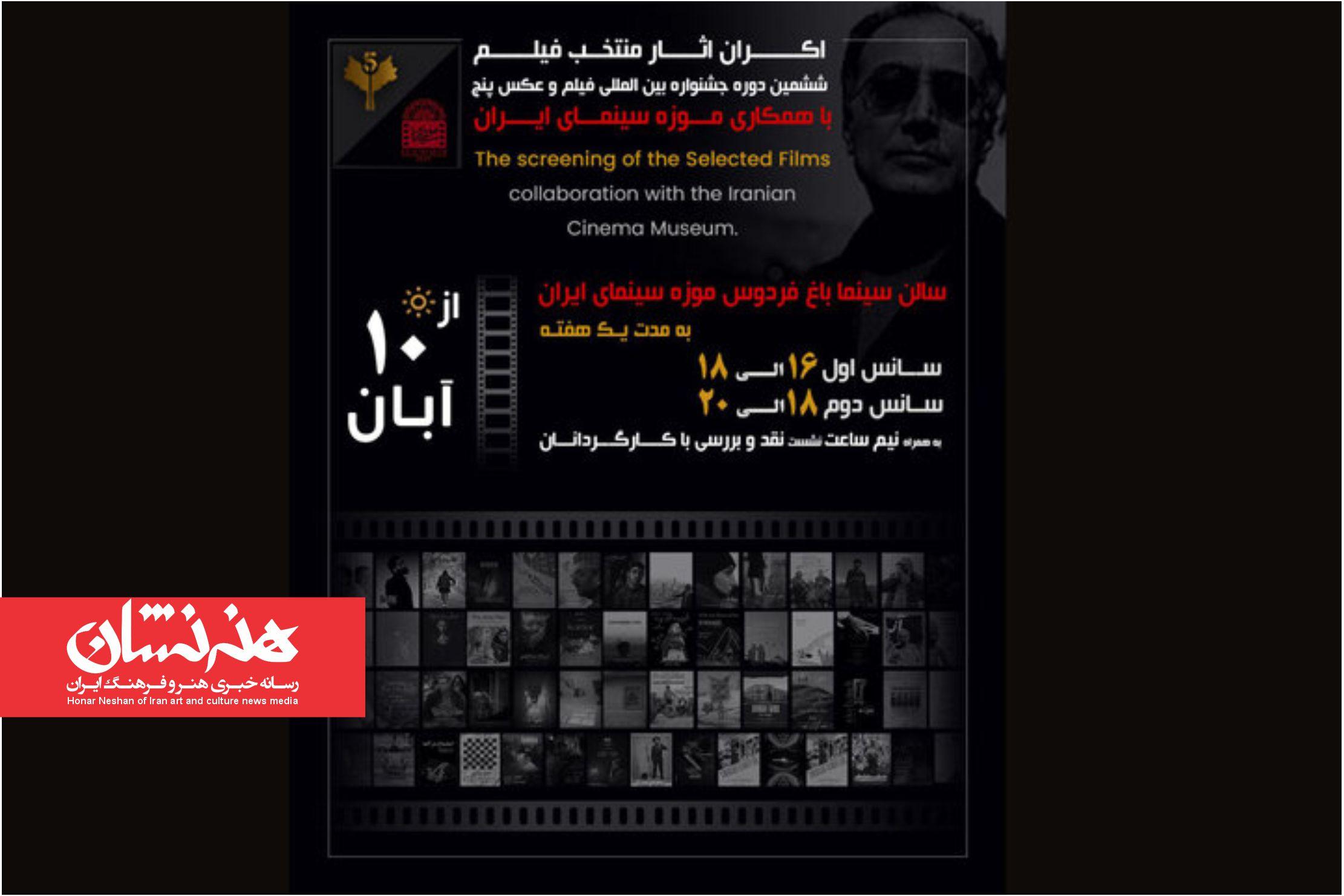 به گزارش هنرنشان به نقل از روابط عمومی جشنواره، فیلم‌های منتخب ششمین جشنواره بین‌المللی فیلم و عکس «پنج» از کشورهایی همچون ژاپن، ترکیه، رومانی، روسیه، چین و … قرار است از ۱۰ آبان به مدت یک هفته در ۲ سانس از ساعت ۱۶ الی ۱۸ و ۱۸ الی ۲۰ در سالن فردوس موزه سینما اکران شوند.