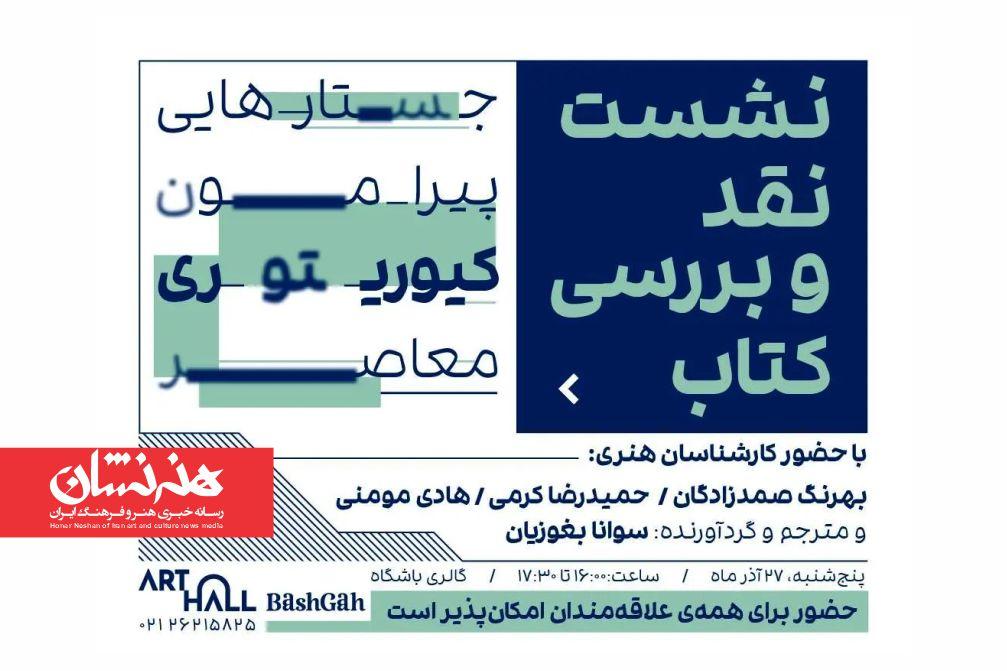 نشست نقد و بررسی کتاب جستارهایی پیرامون کیوریتوری معاصر به ترجمه و گردآوری سوانا بغوزیان از نشر تالار هنر، با حضور کارشناسان هنری در روز پنجشنبه، تاریخ 27 آذر ماه در گالری «باشگاه» برگزار میشود.