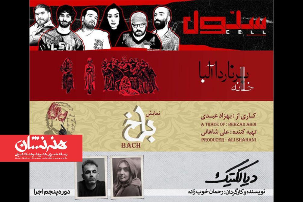همچنین «باخ» به نویسندگی و کارگردانی بهزاد عبدی به تهیه کنندگی علی شاهانی از ابتدای بهمن روی صحنه رفته و تا آخر اسفند هر روز ساعت ۱۹:۳۰ به مدت ۷۰ دقیقه اجرا میشود.